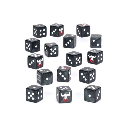 This is a set of 16 six-sided dice with squared edges for use in games of Warhammer 40,000, themed around Ghazghkull Thraka. They are cast in pearlised black acrylic plastic with white and metallic red ink markings, and measure 16mm along each edge. The 1-5 facings are traditionally pipped, and each '6' face is decorated with the brutal (but kunnin') icon of Ghazghkull Thraka. These themed dice are only available while stocks last.