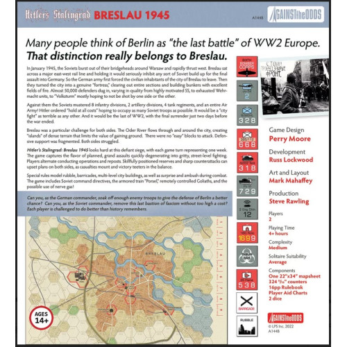 Hitler's Stalingrad: Breslau 1945, looks hard at this defiant siege. With over 300 counters and a 22" x 34" map scaled at about 650 yards per hex, a game turn represents one week. The game captures the flavor of planned, grand assaults quickly degenerating into gritty, street-level fighting, with players alternating conducting operations during the turn. Skillfully positioned reserves and sharp counterattacks can blunt massive thrusts, but at possibly a too frightfully high rate of casualties. Special rules model rubble and barricades; the multi-level city buildings; surprise and ambush during combat; Soviet command directives; the armored train "Porsel"; remotely controlled Goliaths; and the possible use of nerve gas