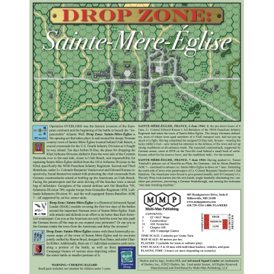 Drop Zone: Sainte-Mère-Église is a Historical Advanced Squad Leader (HASL) module covering the first two days of the battles around the important Norman town of Sainte-Mère-Église. Each side attacks and defends in an effort to do better than their historical counterpart. Drop Zone: Sainte-Mère-Église comes with three historically-accurate maps of the town of Sainte-Mère-Église and its environs jointly crafted by Sharon Boyd, designer Ken Dunn, and artist Charlie Kibler. Additionally, there are 11 individual scenarios each recreating a portion of the battle, as well as three Campaign Games of various sizes depicting either the entire battle or smaller portions of it.