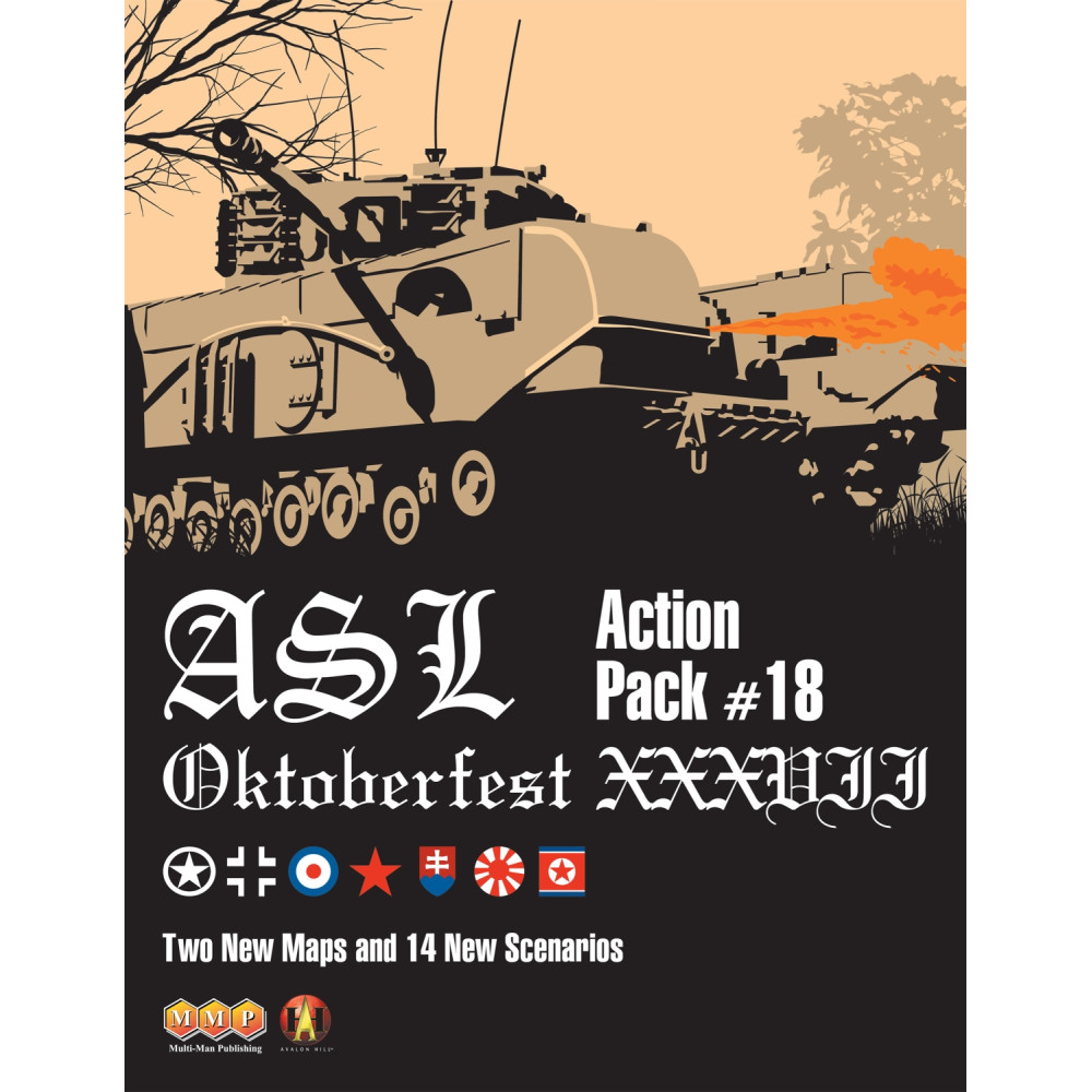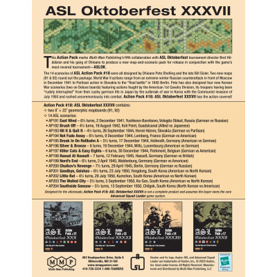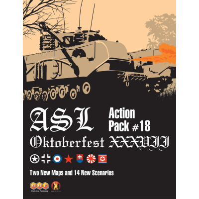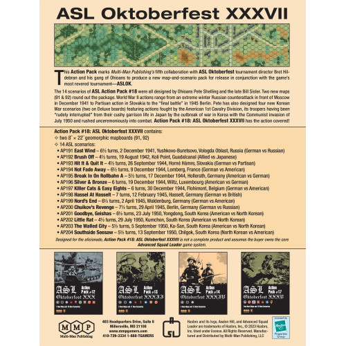 REF: MMPASLAP18The 14 scenarios of ASL Action Pack #18 were all designed by Ohioans Pete Shelling and the late Bill Sisler. Two new maps (91 & 92) round out the package. World War II actions range from an extreme winter Russian counterattack in front of Moscow in December 1941 to Partisan action in Slovakia to the “final battle” in 1945 Berlin. Pete has also designed four new Korean War scenarios (two on Deluxe boards) featuring actions fought by the American 1st Cavalry Division, its troopers having been “rudely interrupted” from their cushy garrison life in Japan by the outbreak of war in Korea with the Communist invasion of July 1950 and rushed unceremoniously into combat. Action Pack #18: ASL Oktoberfest XXXVII has the action covered!