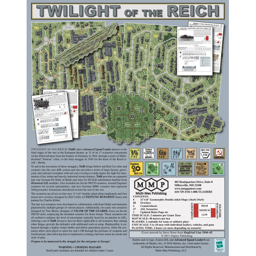 REF: MMPTOTRTWILIGHT OF THE REICH (TotR) takes ASL players to the final stages of the war in the European theater, as 15 of its 17 scenarios concentrate on the Allied advance from the borders of Germany in 1944, through a series of Hitler-declared “fortress” cities, to the final struggle in 1945 for the heart of the Reich itself—Berlin. TotR brings Debris and Rail Car rules and counters into the core ASL system and provides a series of large factory, graveyard, and railyard (complete with rail cars) overlays to help depict the fight for domination of key urban and heavily industrial terrain features.