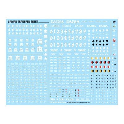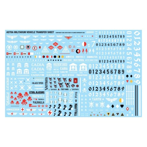 The Cadian Transfer Sheet features 597 high-quality waterslide transfers, and the Astra Militarum Vehicle Transfer Sheet features 475 high-quality waterslide transfers. These include Cadian symbols, along with numerals and other markings to decorate your miniatures.