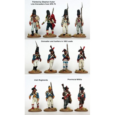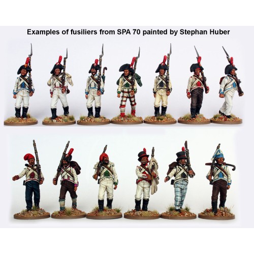REF: SPA70This box allows you to build Line Infantry, Provincial Militia, Grenadiers and Light Infantry. There is a wide selection of headgear including bicornes, fur grenadier caps, fatigue bonnets, shakos and civilian headdresses in both sets. They can be represented as marching formally or casually. Both this set and SPA 80 are designed to be completely compatible plus with both boxes additional poses such as standing at ease or skirmishing can be created.