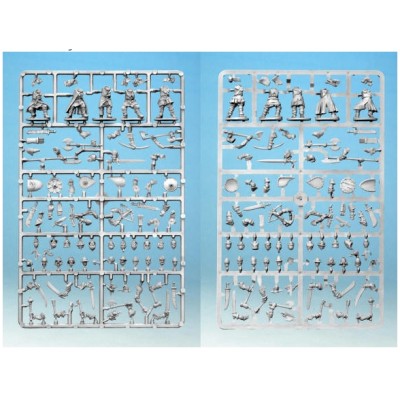 The plastic figures are 28mm sized, supplied unpainted and require assembly with glue. We recommend you use glue designed for plastic to get the best results.