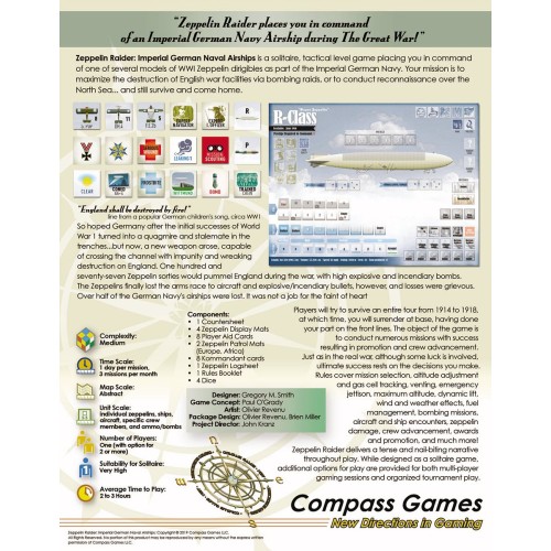 REF: COM1096Zeppelin Raider: Imperial German Naval Airships is a solitaire, tactical level game placing you in command of one of several models of WWI Zeppelin dirigibles as part of the Imperial German Navy. Your mission is to destroy as much English war facilities as possible via bombing raids, or to conduct reconnaissance over the North Sea…..and still survive and come home.