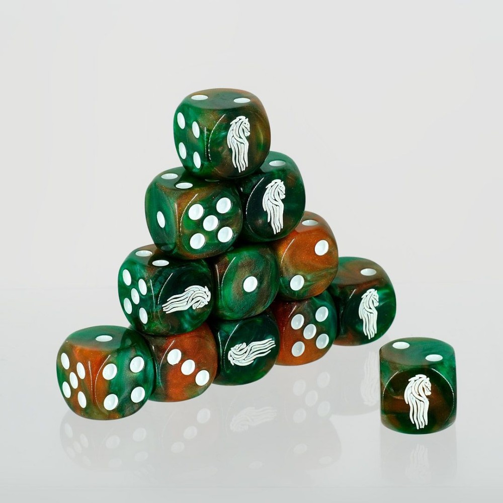 Set of 12 green and black marbeled acrylic dice with white numbers and logo to play with Dark Angels.