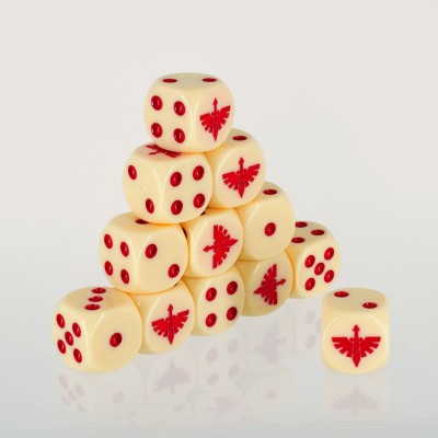 Set of 12 trasparent red acrylic dice with white numbers and logo to play with Adeptus Mechanicus.
