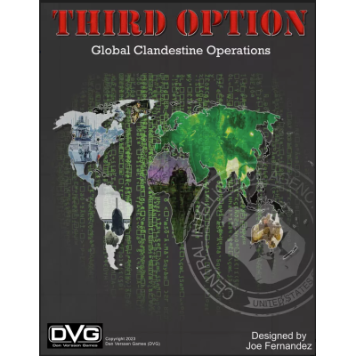 Third Option is a solitaire game played on a mission mat where the player selects, deploys, and maneuvers teams and assets representing U.S. clandestine services with an emphasis on paramilitary operations against adversaries around the world. A “Phase” system is used along with dice, cards, and counters to play out varied missions. The world map is divided into the six Areas of Operations for the United States Military Central Command. Within these geographical areas, the Special Operations Command known as SOCOM, and the U.S. Intelligence apparatus execute highly covert actions against hostile forces who threaten the national security interests of the United States and its allies.