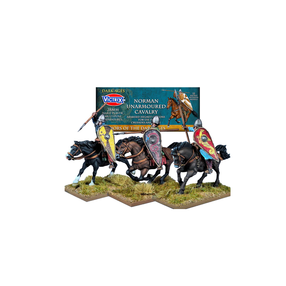 REF: VXDA012The Norman Unarmoured Cavalry set includes 12 highly detailed 28mm plastic figures with a whole host of head, weapon and shield options. These represent the mounted sergeants and retainers that would fight alongside the more heavily equipped Norman knights. Quite possibly they formed the second rank to a Norman cavalry charge to add weight and impetus. With this set you can create Normans, Bretons, Spanish, Islamic/Andalusian light cavalry or early Crusader knight retainers/squires.