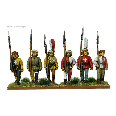 Unarmoured Swiss halberdiers pikemen marching