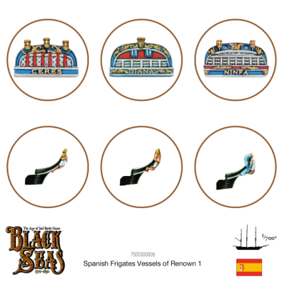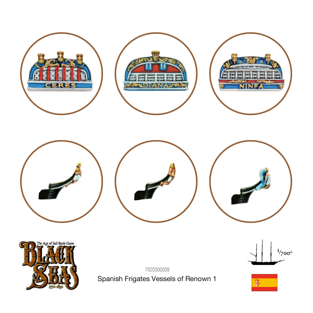 Upgrade your Spanish Frigates with this pack of finely detailed metal figureheads and backplates, allowing you to field Ceres, Diana, and Ninfa.