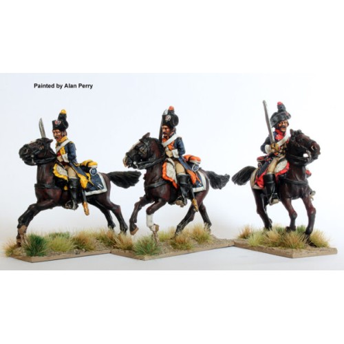3 figuras de metal de caballería pesada francesa de las Guerras Revolucionarias 1789-1799 galopando.