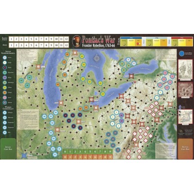 REF: COMPONThanks to Indian resentment over the French surrender of their lands and the harsh policies of General Jeffery Amherst, governor-general of British North America, 20+ Indian nations rose up under the charismatic leadership of the Ottawa sachem, Pontiac and the Lenape Holy Man, Neolin. Pontiac’s War attempts to recreate the reaction of Indian leaders to British mishandling of frontier politics and the impending colonial crisis it presaged. Building on the point-to-point system and loose Indian alliances used in King Philip's War, this design expands frontier conflict using Battle cards to introduce combat chaos, British expenditure on troops, Uncertain Indian Arms supply, siege rules, the capture of prisoners, French interference and trader influence.
