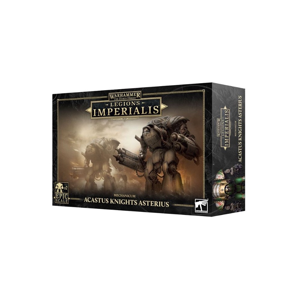 REF: 03-86This multipart plastic kit builds two Acastus Knights Asterius, devastating war machines for your Mechanicum, Dark Mechanicum, or Questoris Familia armies, or as allies in your Legiones Astartes or Solar Auxilia armies, in games of Legions Imperialis. Equipped with a lethal arsenal, they can take on everything from massed infantry to heavy armour, other Knights, and even Titans. If you're looking for some serious firepower to add to your forces, these massive, heavily armoured Knights are an imposing way to add it. The Karacnos mortar batteries can be assembled open or closed on both miniatures.