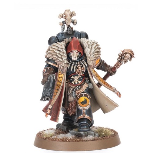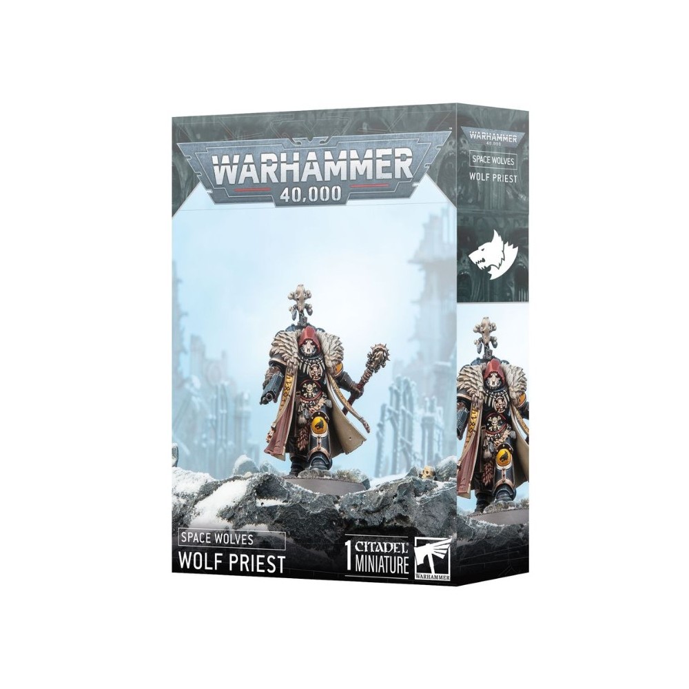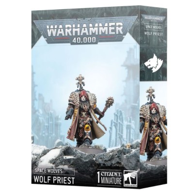 Wolf Priests are elder sages who tend to the spiritual and physical well‑being of their battle‑brothers. Clad in black, bedecked with shamanistic totems and wearing macabre wolf‑skull helms, they are terrifying to behold.