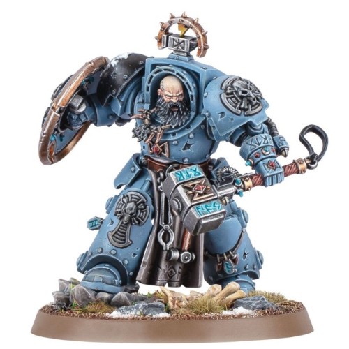 Arjac Rockfist is a towering mass of muscle and a taciturn anvil of endurance. Wielding the enormous Foehammer, he crushes his foes with pulverising strength. As the personal champion of the Great Wolf, Arjac upholds the honour of the Chapter.