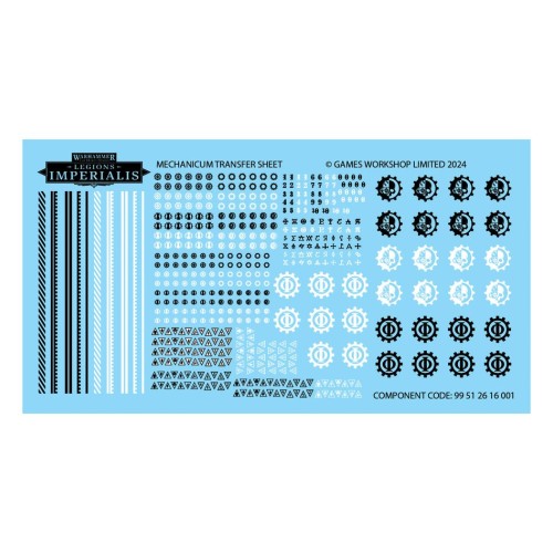 This kit also comes with 2x Mechanicum Transfer Sheets, each containing 500 high-quality waterslide transfers, including logos, numerals, cogs, and more.