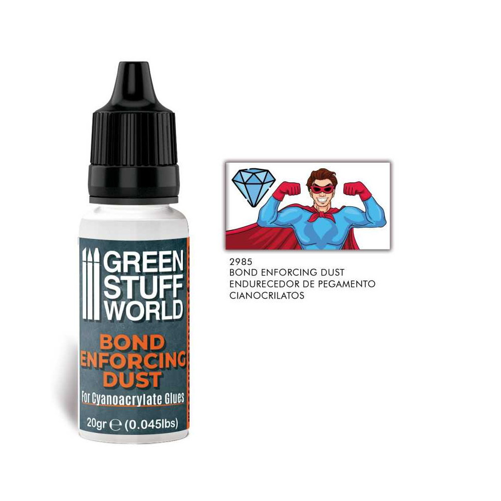 This Hardening Dust for cyanoacrylate glues is a specialized product designed by Green Stuff World to enhance the filling and bond strength of cyanoacrylate glues either in liquid or gel formulations. It is a highly refined powder with a granulometry ranging from 45 to 90 microns, which optimizes its hardening effect.