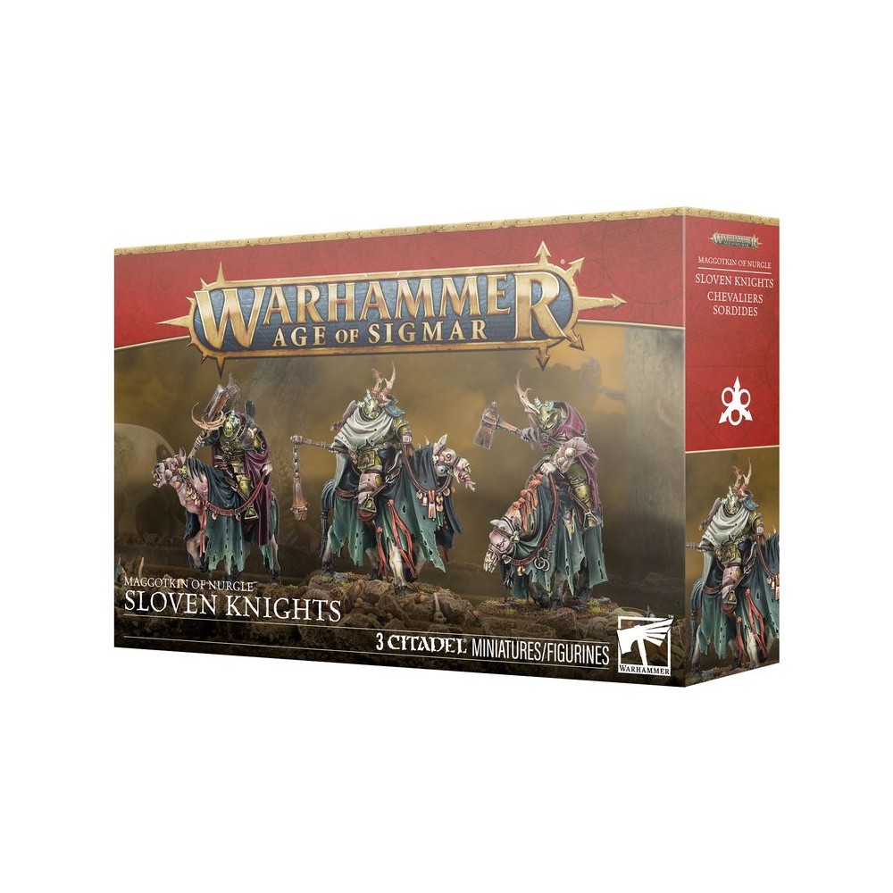 This multipart plastic kit builds three Sloven Knights, elite cavalry for your Maggotkin of Nurgle armies in games of Warhammer Age of Sigmar. Riding mutated, foetid nags, they can respond quickly to changes in the battle and get to grips with the enemy faster than your infantry. Rather than the noble lances they once carried, they are now armed with entropic bludgeons – brutal weapons that make a mockery of enemy armour. The kit includes five interchangeable heads – including one that makes an optional champion – and another head that can be used on two of the Sloven Knights, offering a degree of customisation to your twisted cavalry.