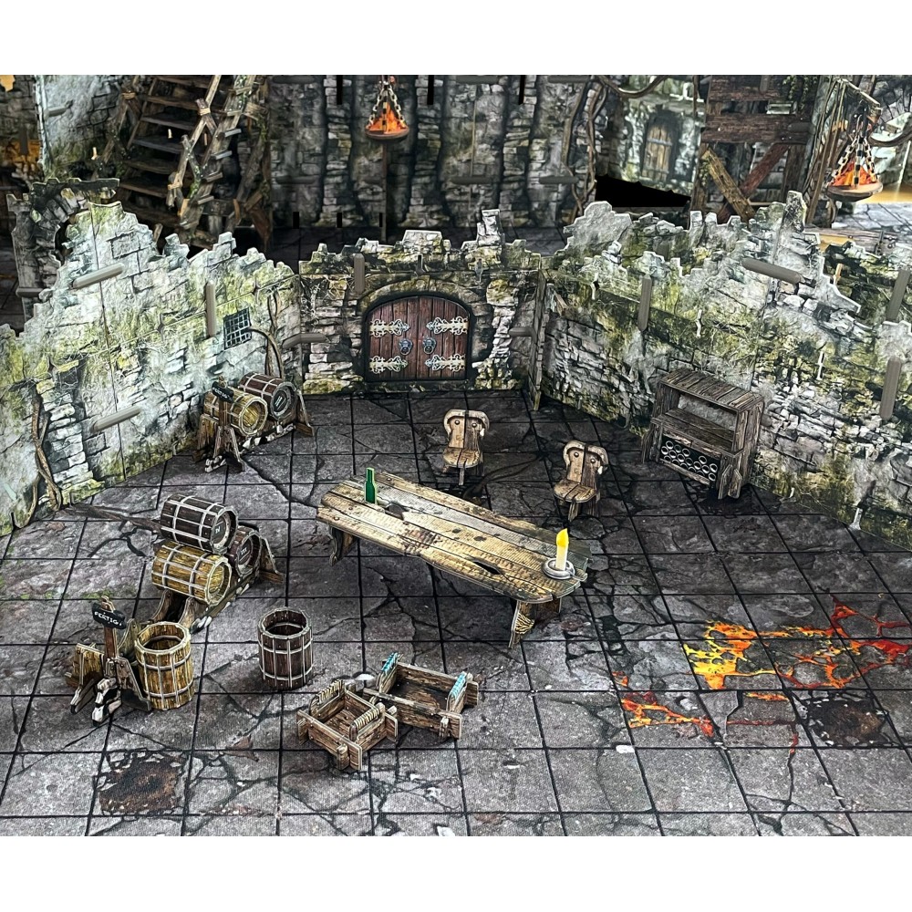 This Wine Cellar set expands your dungeon with a wine cellar – the perfect objective for thirsty adventurers! It includes an ornate entrance, plenty of barrels and a table to sit and relax.