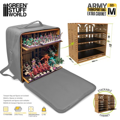 Extra Cabinet is designed to complement the transport and storage of miniatures. It can be used both as an additional cabinet for the GSW Army Transport Bag and as a free-standing stackable storage system. Manufactured of MDF wood is capable of accommodating more than 200 miniatures distributed among its rack levels.