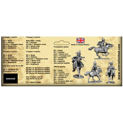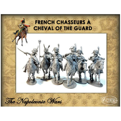 REF: VX0024This set includes 12 dynamic charging French Chasseurs a cheval of the Imperial Guard, one of Napoleons Elite light cavalry Regiments. The set depicts the Chasseurs a Cheval in the striking full dress uniform. The detail of the lace work and Pelisse is superb and will take the paint and washes easily. Even though Guidons were not carried often in the field they have included a flag pole arm and some extra flag poles for those who wish to use them on the French Dragoons and Polish lancers sets that Victrix have out.