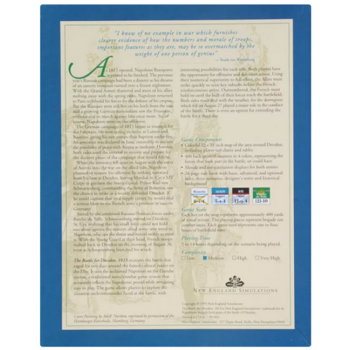REF: NES002The Battle for Dresden, 1813 is a brigade level, two-player simulation depicting the two days of battle in and around the city of Dresden during Napoleon's 1813 campaign in Germany. One player controls the French forces, while the other player controls the combined Austrian, Russian and Prussian forces. The playing pieces denote the actual military formations available during the battle. The game map is a representation of the area in which those formations fought. Each player, through a structured sequence of play, maneuvers his units on the map and engages adjacent enemy units in combat