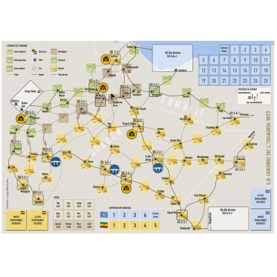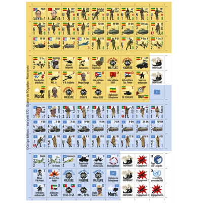 This simulation uses modified and simplified rules from the game Angola 1987-1988 (VaeVictis 154). The game is won on diplomatic terrain. Tipping international organizations (UN, OAU, Arab League) to one’s side has a direct impact on victory but the Somali player can achieve military victory before Soviet and Cuban aid tilts the victory to the Ethiopian side.