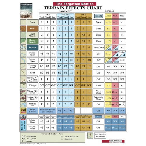 The Forgotten Battles is a large-sized OCS game, with over 1,300 combat units and a 44x66-inch map layout at a scale of 5-mile hex/3.5 days per turn. The full Campaign game is 63 turns long, and there are two campaign scenarios so players can start at different points in the action. Also included are several one-map scenarios, and a scenario that uses both The Third Winter and The Forgotten Battles maps.