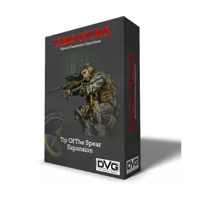Tip of the Spear expansion for Third Option adds unique units with enhanced capabilities. Twelve Tier 1 Sea, Ground, and Air Branch Team unit cards with corresponding counters that include DEVGRU SEAL Team 6, and U.S. Army Delta among others. The expansion also includes new event and asset cards for a total of 42 cards and six counters.