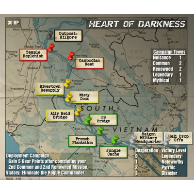 Lead your squad into the Vietnamese heart of darkness on a top secret kill mission to take down an Army Colonel that has gone rogue. This is the first of the"Campaign Packs". In it, you'll find Soldier cards of levels 1 to 6 (like PMC), Campaign specific Hostiles, Missions, Locations, Objectives, and a Campaign Map! A Campaign Pack is roughly a dozen missions linked to a central story. You start with a team of inexperienced soldiers, and with each mission, you gain experience and gear. The missions become more difficult as you fight your way through the campaign. At the end of the campaign, you'll face the ultimate encounter! Campaign Pack includes: 3 decks of cards, 1 counter sheet, and 1 map sheet