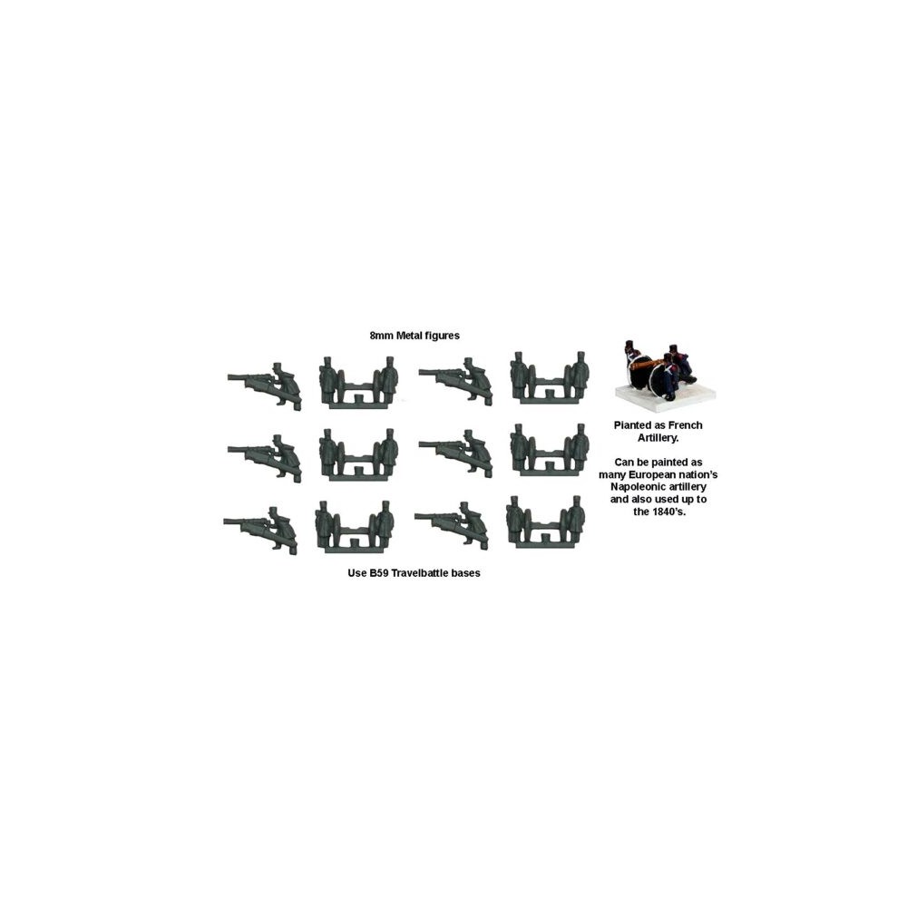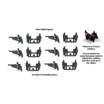 6 8mm metal cannons with gunners wearing bicorn hats from the Napoleonic Wars. They can be painted as Spanish or French
