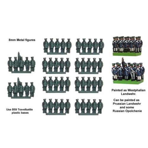 50 Napoleon-era metal figures, 8mm, for the game Travel Battles. They can be painted as Spanish soldiers from 1808 for the War of Independence....