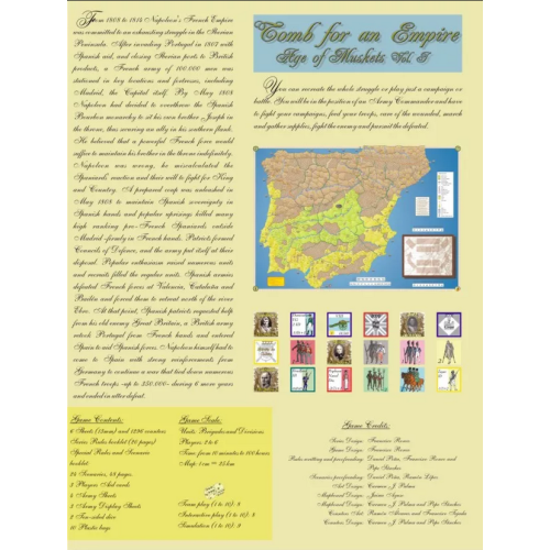 "Tomb for an Empire" simulates the conflict that took place in the Iberian Peninsula from 1808 to 1814. It was a complex war that involved diverse interests and troops from many nations. Great Britain sent her troops to defend Portugal, within the context of the European Coalitions against France. In Spain proper the war, which presented certain aspects of a civil war, saw an uneasy alliance of reformists and traditionalists under the name of "Patriots" facing the puppet King Jose I Bonaparte and the occupation army; composed mainly of French but also of Italians, Neapolitans, Poles, Germans, Swiss, Dutch and even Spaniards (known as "Juramentados"). "Tomb for an Empire" is not just a game it's a whole gaming experience that includes 6 introductory scenarios and 18 campaign scenarios