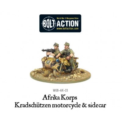 REF: WGB-AK-23Key to the campaign waged in the Western Desert was mobility in order to cross the vast sandy deserts. As a result both sides relied heavily on tanks and transports. Amongst these were the BMW 75 and Zundapp motorcycles utilised by the Deutsche Afrika Korps and adding extra speed and manoeuvrability to your Afrika Korps force.