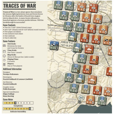REF: VUFT0011Traces of War is a two-player game that simulates the intense fighting between Axis and Soviet forces after the battle of Kursk during August 1943 to March 1944. A major Soviet offensive is launched against a German mobile defense. Will the breakthrough be successful?