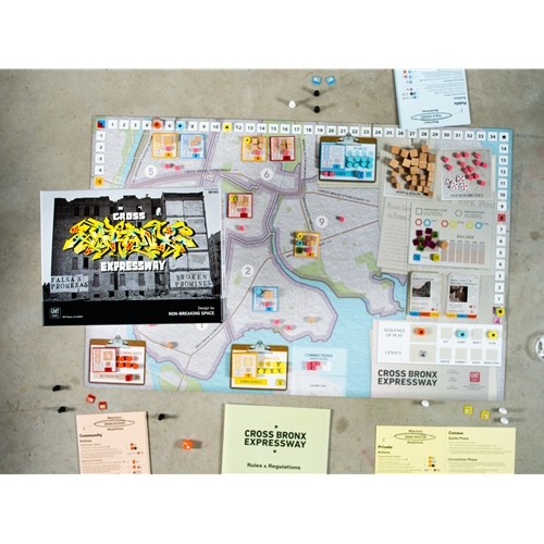 Through a card driven sequence of play, they will work to solve the economic challenges facing the area by building infrastructure and organizations, forming coalitions, mitigating the multitude of issues facing the vulnerable population, and managing resources to stay out of debt. Cross Bronx Expressway offers an engaging way to learn about the recent history of American cities, as exemplified by Jane Jacobs' pivotal work The Death and Life of Great American Cities, simulated through the case study of the South Bronx. Players will experience the conflicting incentives and complex factors shaping urban life and together determine the fate of the Bronx.