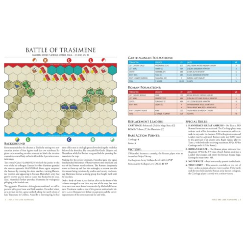 REF: WPHTLHANNIBALHold the Line: Hannibal is a grand tactical two-player game covering 10 of the greatest battles of the Punic Wars. Following in the footsteps of Worthington’s Hold the Line series, Hannibal uses the same standard size map board, 13 hexes wide and 9 hexes deep. Combat is resolved with custom dice.