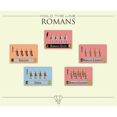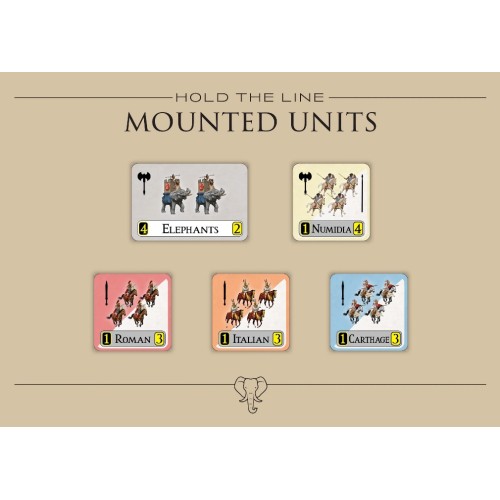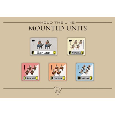 Hold the Line: Hannibal is a grand tactical two-player game covering 10 of the greatest battles of the Punic Wars. Following in the footsteps of Richard Borg’s Commands and Colors system and more directly Worthington’s Hold the Line series, Hannibal includes the same standard size map board, 13 hexes wide and 9 hexes deep. Combat is resolved with custom dice.