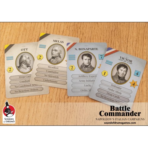 A persona card represents each Commander, his specific abilities and your Army’s resources; the all-important Subordinate Leaders are integrated in an innovative multi-role card system. Morale and troop skill are a core mechanic: demoralizing the enemy goes a long way towards winning the fight, with Armies slowly degrading in performance, until the breaking point! Casualties are managed effortlessly, and a correct “Battlefield Look” maintained at all times.