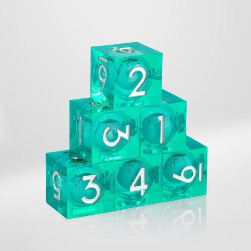 Set of 12 trasparent red acrylic dice with white numbers and logo to play with Adeptus Mechanicus.