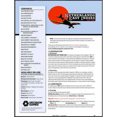 Netherlands East Indies: 1941 - 1942 is an operational wargame of the campaign in 1941-42 in which the Japanese seized control of the Dutch colonial empire in the South Pacific. NEI is a combined naval-air-land campaign, in which operational capabilities can be decisive. The game system shows the effects of various operations over the course of a scenario. Players conduct Actions which encompass discrete combat, logistical, intelligence and other operations. A player can conduct one or more Actions per turn. All units in the game use a similar combat system. The system shows the interaction of naval, air and land forces. At stake: the resources of the South Seas and the gateways to the Indian Ocean and Australia.