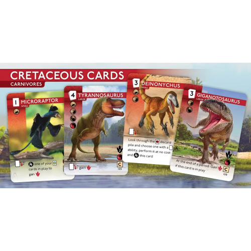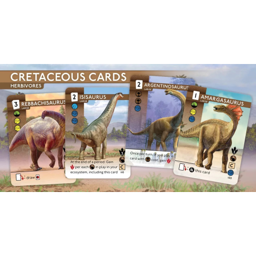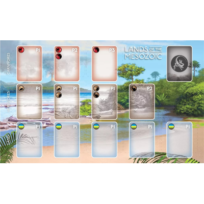 Lands of the Mesozoic is a tableau building game where card play is constantly evolving. In this prehistoric game the dinosaurs are not blood-thirsty monsters constantly fighting with each other, but animals filling vital roles in an ecosystem. Each type of animal is needed to be a balanced ecosystem and to be sustainable in the long term. Competition between the species and the shifting nature of the environment will trigger extinction events of the animals and habitats that, in turn, will open niches for new species to appear and spread.
