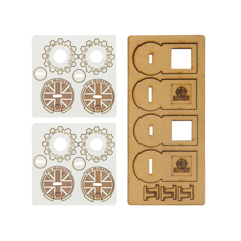 Los pines son una mecánica clave en Bolt Action, y necesitas poder controlarlos para todas tus unidades. Cada uno de estos marcadores te permite controlar los pines de una unidad, del 0 al 11, y guardar su Dado de Orden de forma segura al mismo tiempo, ¡manteniendo tu mesa ordenada y el estado de tus unidades siempre claro!