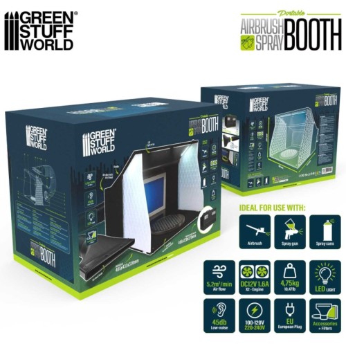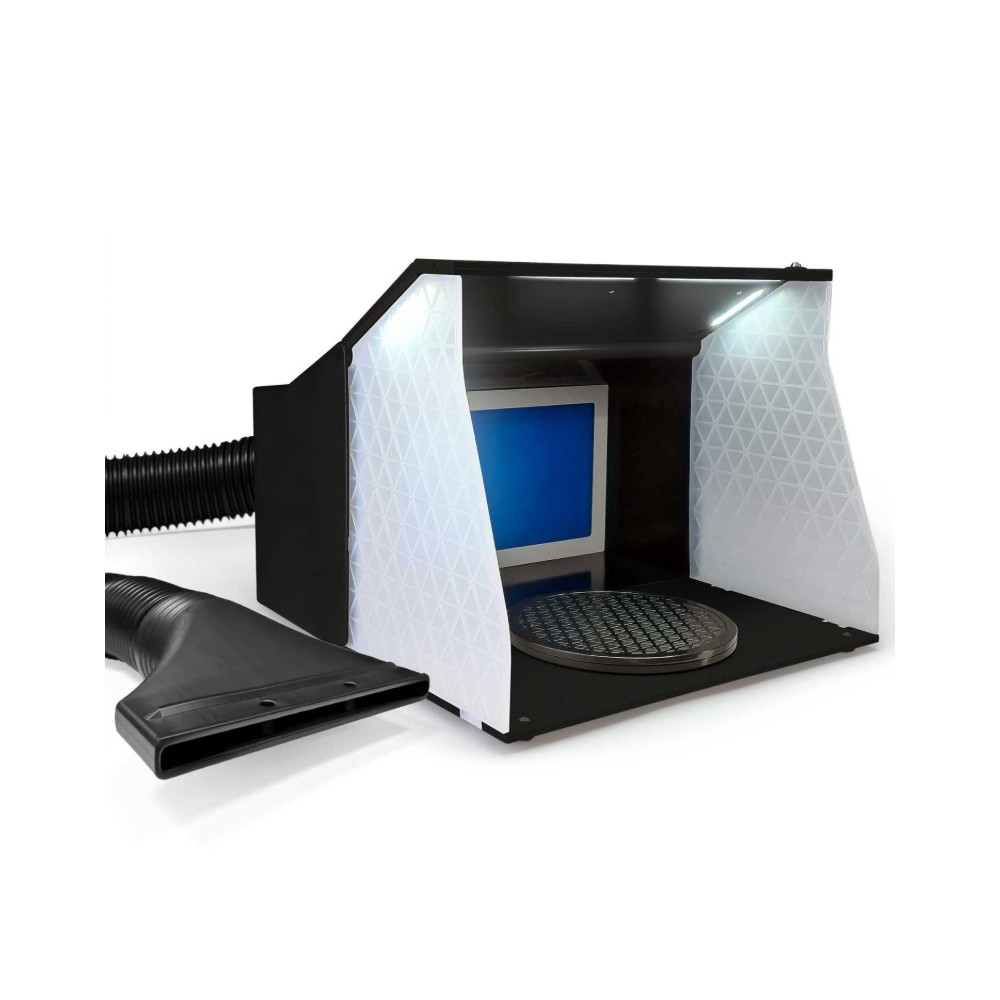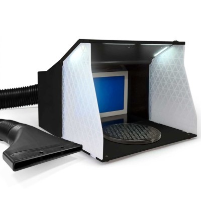 Una cabina de aerografía para modelismo, manualidades y spray es una herramienta esencial para los aficionados que utilizan un aerógrafo para modelismo y desean un entorno de pintura más limpio, cómodo y controlado. Diseñada para miniaturas, maquetas a escala, decorados, manualidades y otros proyectos creativos. Este modelo cuenta con un diseño plegable y extensible con un tubo trasero que se puede conectar a una ventana fuera de tu sala de aficiones para mantener el aire limpio.
