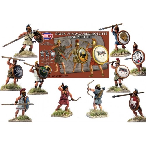 Esta caja contiene hoplitas griegos sin armadura y arqueros griegos en 28mm tanto para coleccionistas como para wargames. Figuras de plástico, requiere montar y pintar