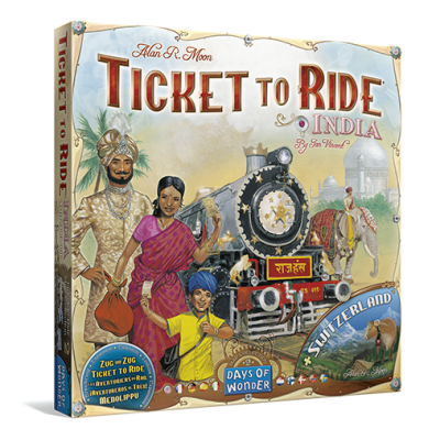 ¡Aventureros al Tren! India es una expansión para 2-4 jugadores, que introduce los Premios de Gran Tour de la India: puntos adicionales que se conceden por cualquier recorrido que tenga dos caminos diferentes entre las ciudades de tus Billetes de Destino. dos mapas diferentes en un solo tablero de doble cara donde los jugadores podrán descubrir de nuevo la intensa lucha por los recorridos que cruzan la accidentada geografía de la India y Suiza.