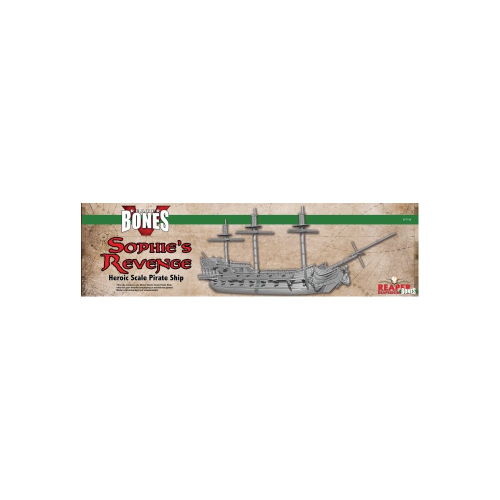 El Megabarco pirata de Reaper Bones, dividido en tres cubiertas y con piezas sueltas para poner como quieras. La superficie del barco lleva el dibujo medio camuflado de las casillas de una pulgada. Los mástiles se enganchan con potentes imanes para poder montarlos para la partida y desmontarlos para guardarlos. Inlcuye 20 cañones, compuertas para las ventanas, los timones, el ancla, el mascarón de proa...