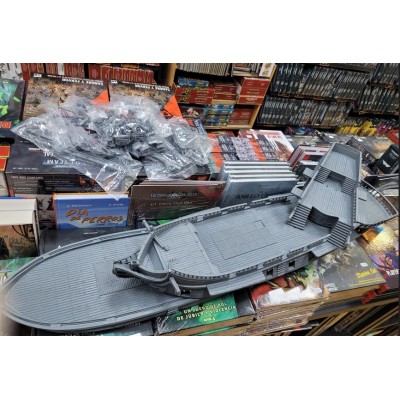 REF: 77748El Megabarco pirata de Reaper Bones, dividido en tres cubiertas y con piezas sueltas para poner como quieras. La superficie del barco lleva el dibujo medio camuflado de las casillas de una pulgada. Los mástiles se enganchan con potentes imanes para poder montarlos para la partida y desmontarlos para guardarlos. Inlcuye 20 cañones, compuertas para las ventanas, los timones, el ancla, el mascarón de proa...