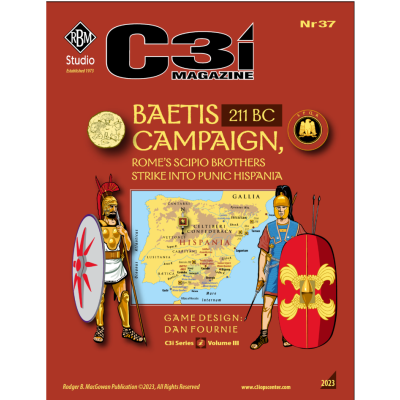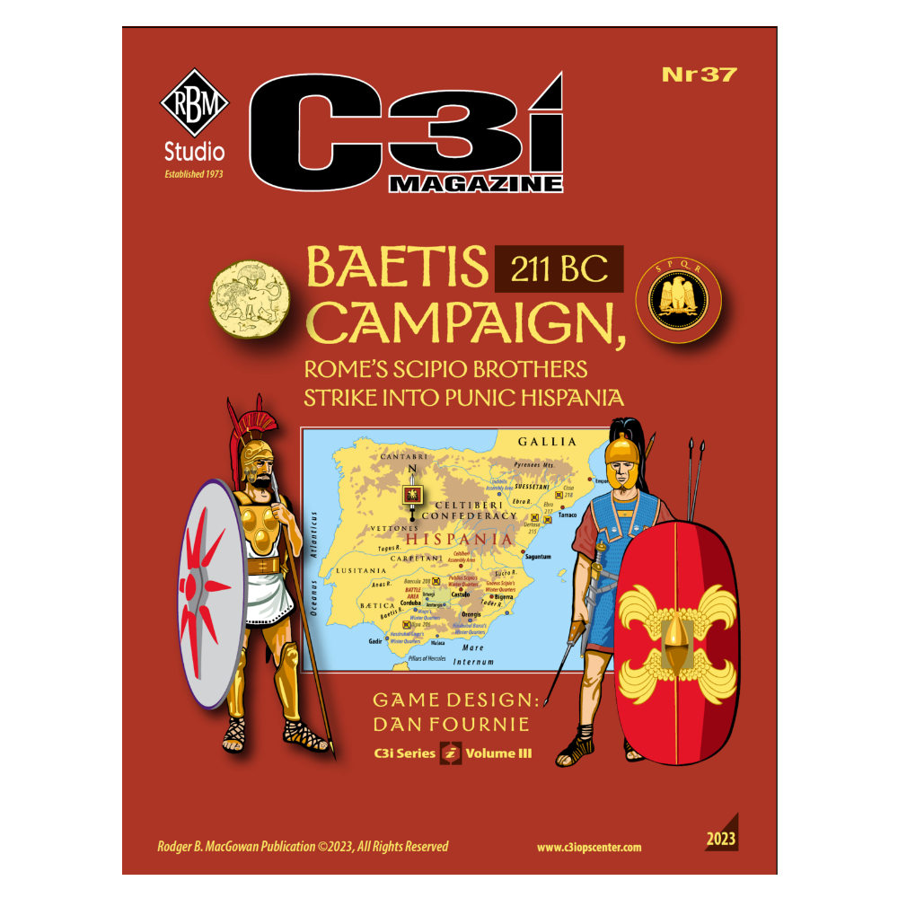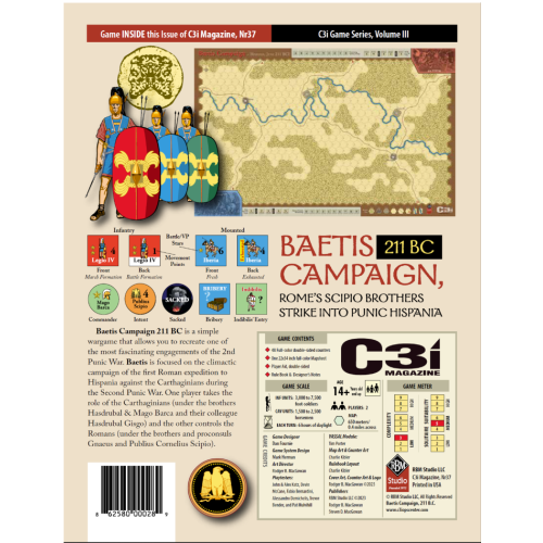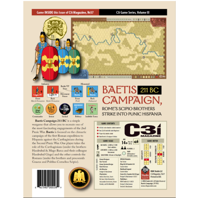 C3i Nr 37 presenta la esperada "Baetis Campaign, 211 BC" de Dan Fournie, una nueva entrega de la serie C3i. Incluye un mapa de 22" x 34" con 48 fichas, ayuda para el jugador y un libro de reglas con notas del diseñador.